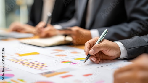 Business professionals analyzing colorful charts and graphs during a meeting, taking notes and discussing financial data.