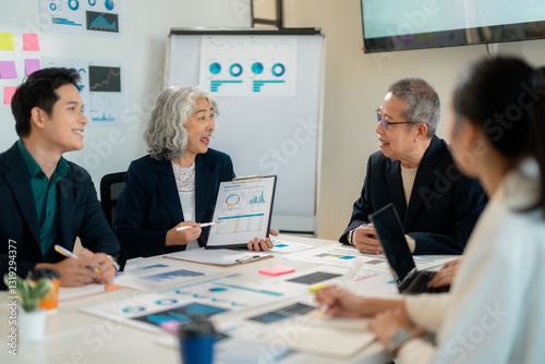 Business professionals analyzing financial data at conference table