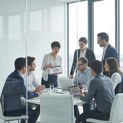 Business professionals collaborating on a modern presentation during a corporate meeting