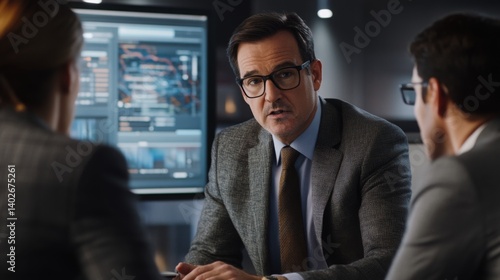 Business professionals engaged in a serious discussion during a meeting in a modern office environment