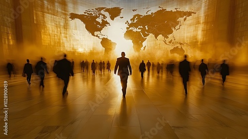 Business professionals in motion with a stock market trend rising upward, blurred world map highlighting global commerce