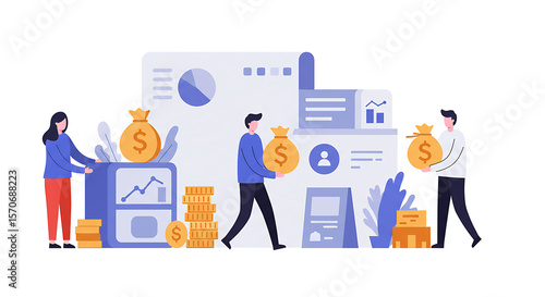 Business professionals interacting with financial data and monetary assets