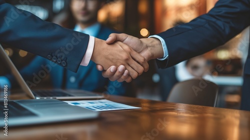 Business professionals shaking hands over a laptop in a cafe during a meeting.