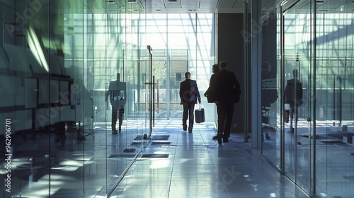 Business professionals walk down a modern, glass-walled corridor, bathed in sunlight creating reflections and silhouettes, evoking a corporate ambiance.