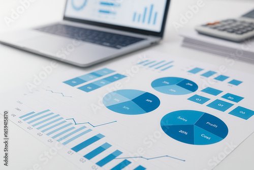 Business report with charts and graphs on table next to laptop and calculator,ideal for modern finance themes,office backgrounds,corporate visuals,and data analysis concepts