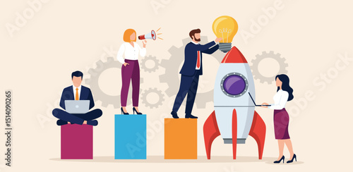 Business Startup Concept. Vector cartoon illustration of a group of diverse people in business suits assembling a rocket for launch.