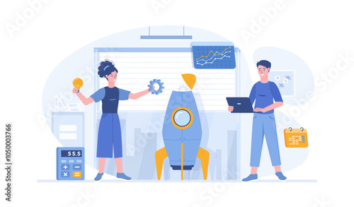 Business startup. Man and woman preparing a rocket for launch. Project success, business planning. Vector illustration with characters in flat design for web banner.