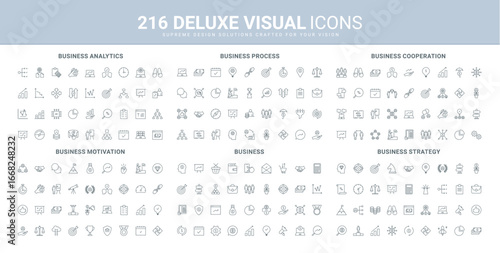 Business strategy analysis, team motivation and cooperation, analytics of trends and alternatives line icons set. Business process development, agreement thin black outline symbols vector illustration