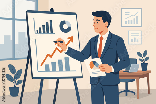 Business strategy and planning concept. Financial and banking metaphor. Businessman analyzing data and drawing graph growth planning of business and economy on office background.