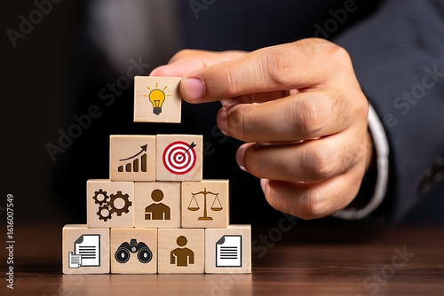 Business strategy and planning concept with wooden blocks showing growth charts target icons people gears and legal symbols with a hand placing the final idea block on top