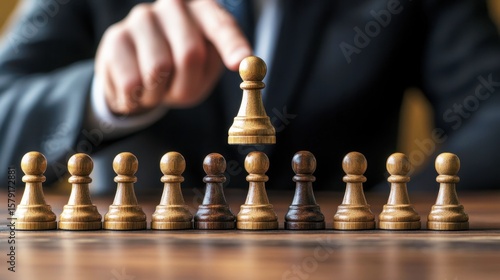 Business Strategy Concept with Wooden Chess Pieces, Man Holding Pawn Above Others in a Professional Setting