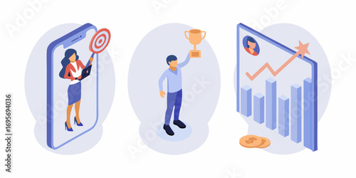 Business success and growth concepts illustrated with isometric figures and business elements
