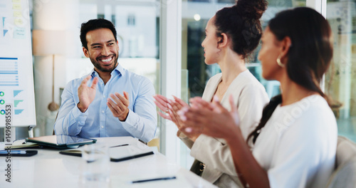 Business, success and people with applause in meeting for finance pitch approval, funding offer and good news. Financial group, employees and celebration in office for corporate deal and investment