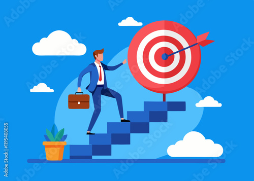 Business Success Concept with Businessman Climbing Steps to Target in Motivational Illustration
