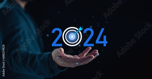 Business target and goals trends 2024. Analytical businessperson planning business growth 2024, strategy digital marketing, profit income, economy, start up business, technical analysis strategy