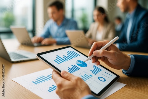 Business team analyzing digital financial charts on tablet with pen in modern office setting during daylight meeting session.