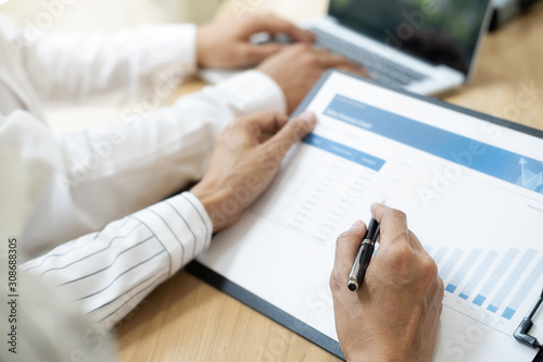 Business team brainstorming and discussing with financial data and report graph. Teamwork meeting working concept.