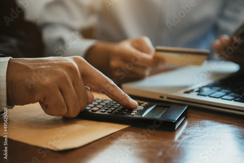 Business team calculates financials with graph paper on the table on the cost of home office in the evening.