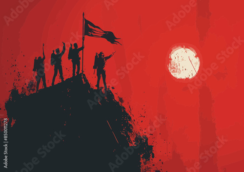 Business Team Celebrating Success on Mountain Peak at Sunrise, Illustrative Concept of Achievement and Support, Red Background Vector Art