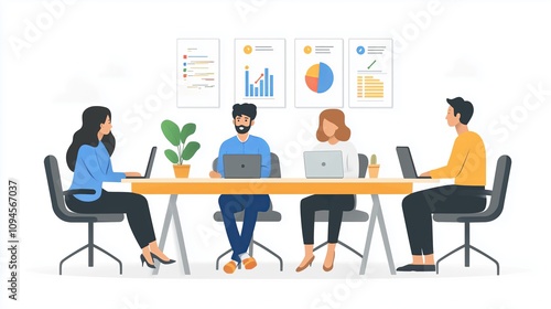 Business team collaborating in modern office with charts and laptops on desk