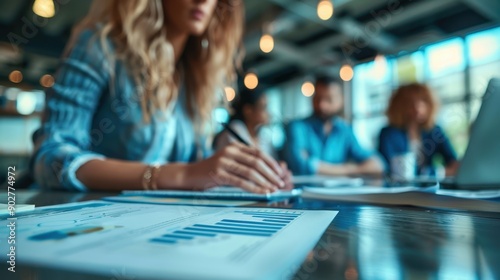 Business Team Collaborating in Modern Office with Focus on Financial Reports and Charts