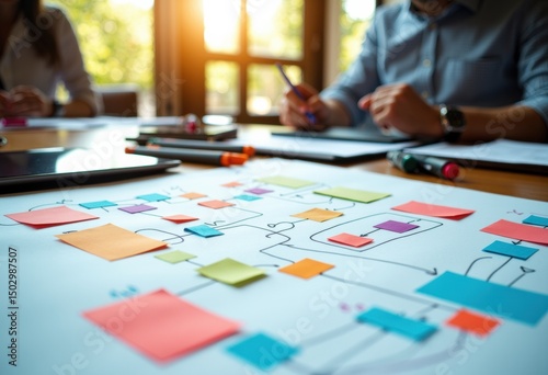 Business team collaborating on project planning with colorful sticky notes and diagrams