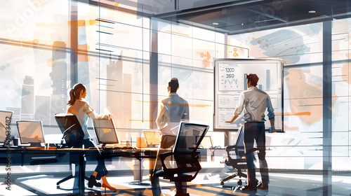 Business team is having a meeting in a modern boardroom, analyzing data projected on a screen