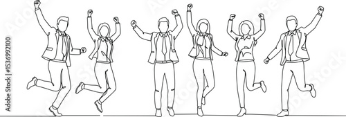 Business team jumping, teamwork success concept, celebrating employees, corporate victory, happy professionals, line drawing style, team joy illustration,