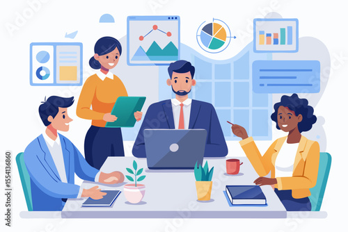 Business Team Meeting with Data Analysis Diverse business team collaborating around table reviewing data and charts business meeting teamwork collaboration data analysis presentation office employees