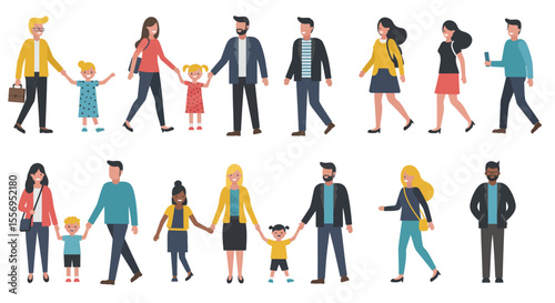 Business team silhouettes: diverse people walking, a collection of workers, men, women, and children