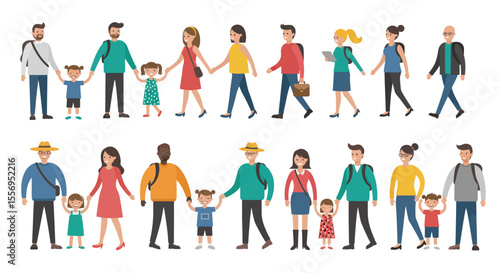 Business team silhouettes: diverse people walking, a collection of workers, men, women, and children