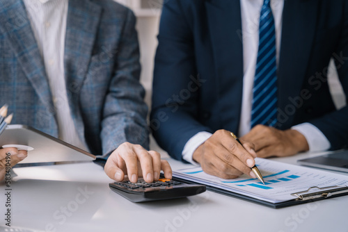 Business team to calculate financial information to invest in new projects.
