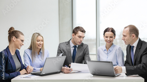 business team with laptop having discussion