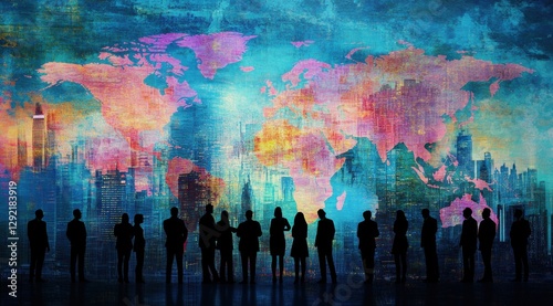 Business team working together, silhouette of business people in the office on an abstract digital map background with blue and pink colors Generative AI