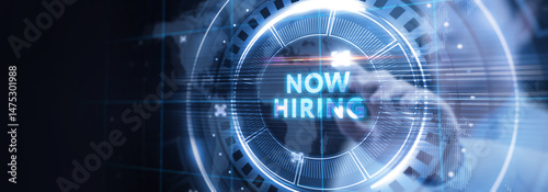 Business, Technology, Internet and network concept. NOW HIRING inscription, modern technology business concept.