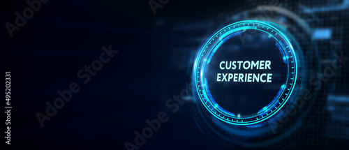 Business, Technology, Internet and network concept. Technology future. Young businessman clicks on the virtual display button: Customer Experience. 3d illustration