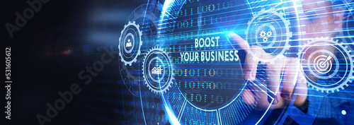 Business, Technology, Internet and network concept. Young businessman shows the word: Boost your business