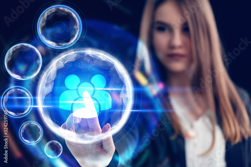 Business, Technology, Internet and network concept. Young businessman working on a virtual screen of the future and sees the inscription: