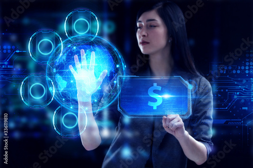 Business, Technology, Internet and network concept. Young businessman working on a virtual screen of the future and sees the inscription: