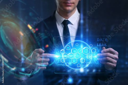 Business, Technology, Internet and network concept. Young businessman working on a virtual screen of the future and sees the inscription: Data leak