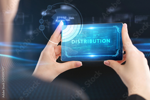 Business, Technology, Internet and network concept. Young businessman working on a virtual screen of the future and sees the inscription: Distribution