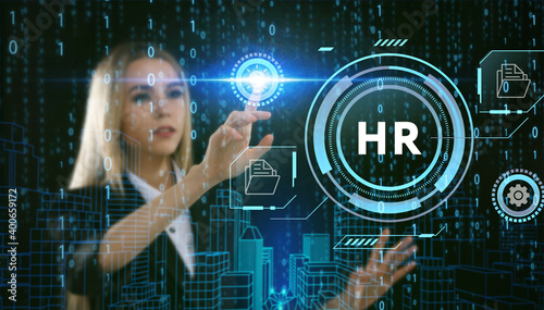 Business, Technology, Internet and network concept. Young businessman working on a virtual screen of the future and sees the inscription: HR
