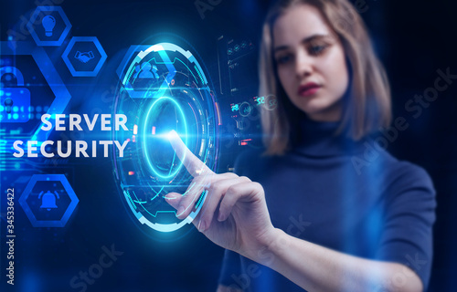 Business, Technology, Internet and network concept. Young businessman working on a virtual screen of the future and sees the inscription: Server security