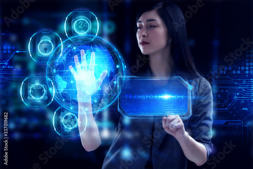Business, Technology, Internet and network concept. Young businessman working on a virtual screen of the future and sees the inscription: Transformation