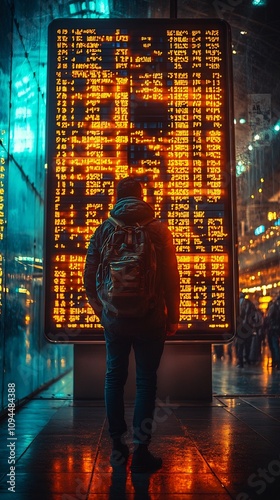 Business Traveler Checking Schedule at Illuminated Airport Departure Board in Rainy City