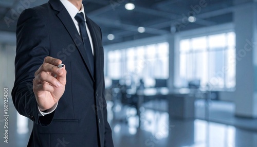 Business wallpaper of a man in a suit holding a pen and pointing somewhere