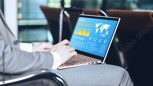Business wireless working on Laptop computer Analyst Business data report Screen showing Statistics, Graphs and Summary Infographics Charts.