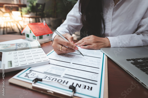 Business Woman calculated cost and sign agreement contract, Insurance Home concept