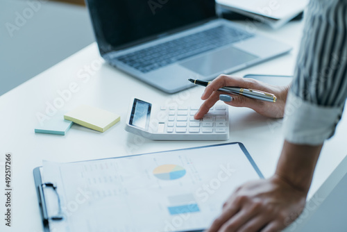business woman hand calculating her monthly expenses during tax season. business financial and investment concept.