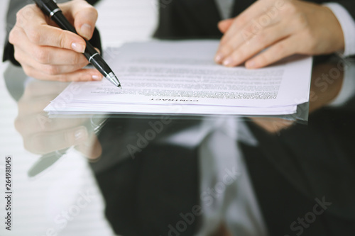 Business woman hands with pen over document of contract at glass table. Agreement signing concept